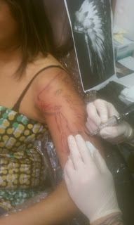 I went to visit my grandpa after the first session and I will never forget the look of disapointment in his eyes when he saw it. As soon as he touched my ink the look faded into disbelief. All he could do was touch my arm and rub the tattoo. Touch some more. Squeeze my arm. Then rub again. I didn't care what he said, his touch said everything I needed to know.